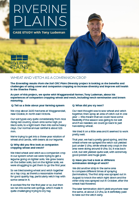 As part of this project, we spoke with Waggarandall farmer, Tony Ludeman, about his experiences of companion cropping wheat and vetch, including vetch termination and brown manuring. Here's what he had to say: